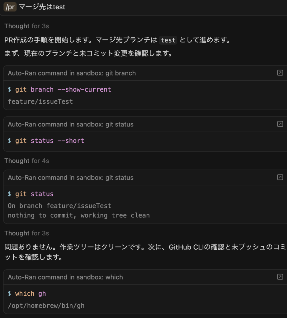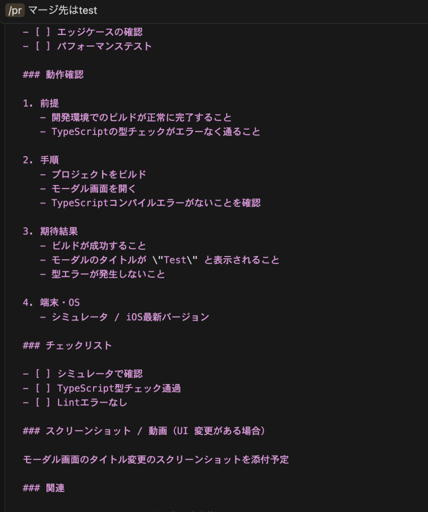 実行コマンド例や、実際に生成されたPR画面のイメージは、スクリーンショット付きで記事中に貼っていますが、ざっくり言うと「/pr を叩くと Draft PR が生え、説明もテンプレートに沿って埋まる」という状態です。