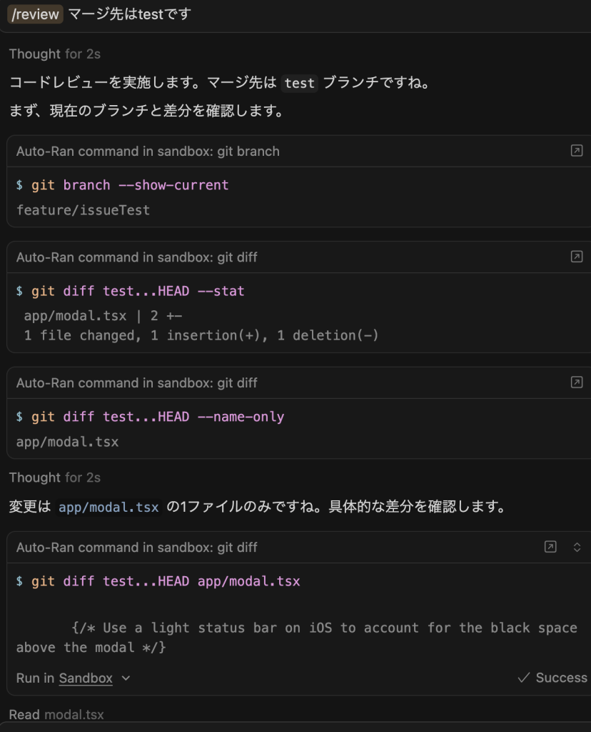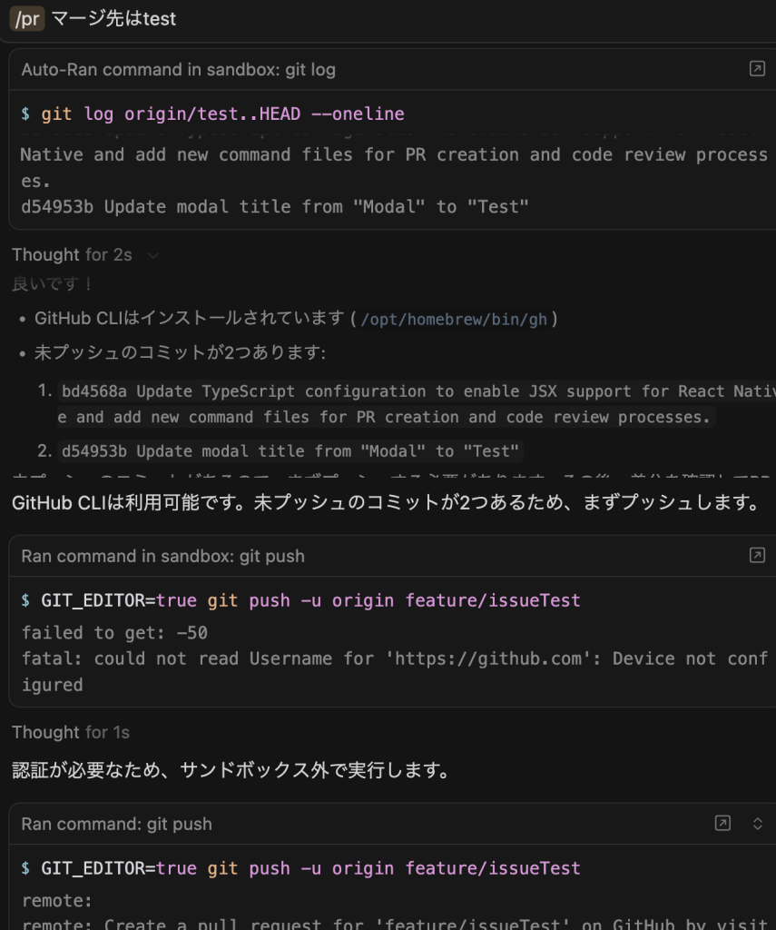 この Commands 機能を、自分の開発フローに合わせて使うことで、レビューとPR作成をまとめて楽にできないか試してみました。