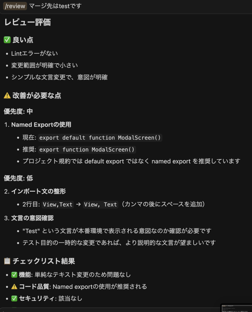 /review Commands では、現在のブランチと main(または develop) の差分をCursorが解析し、以下の観点でレビュー結果を生成します。