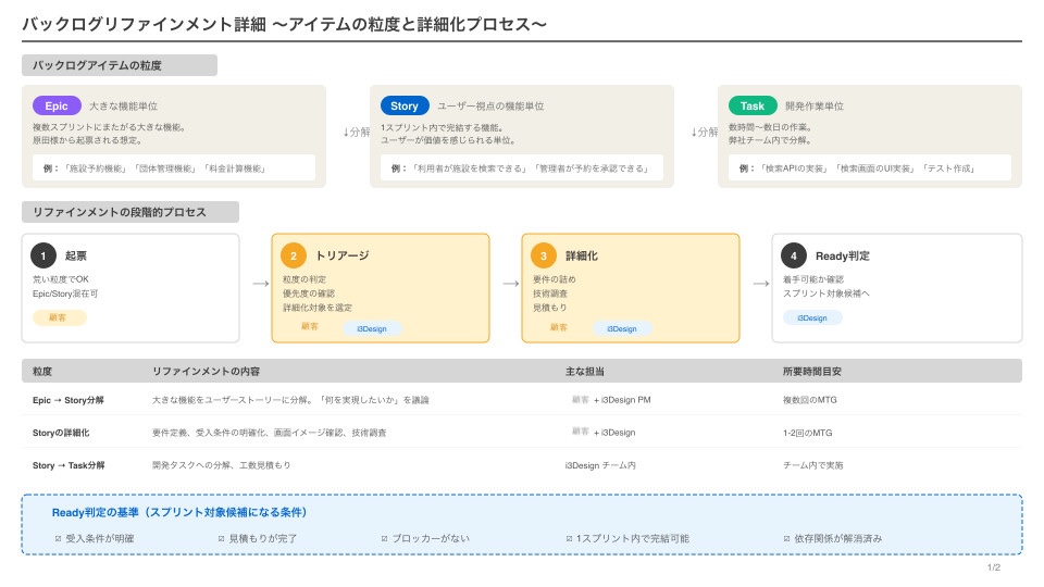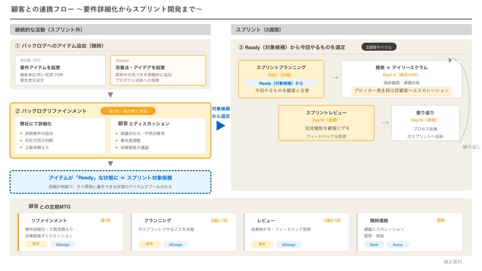 スクラムの流れを説明する資料ではなく、担当者様との連携方法、意思決定のタイミング、バックログリファインメントの役割まで含めて伝える補足資料として、提案の意図が伝わりやすい形に整理できるようになりました。