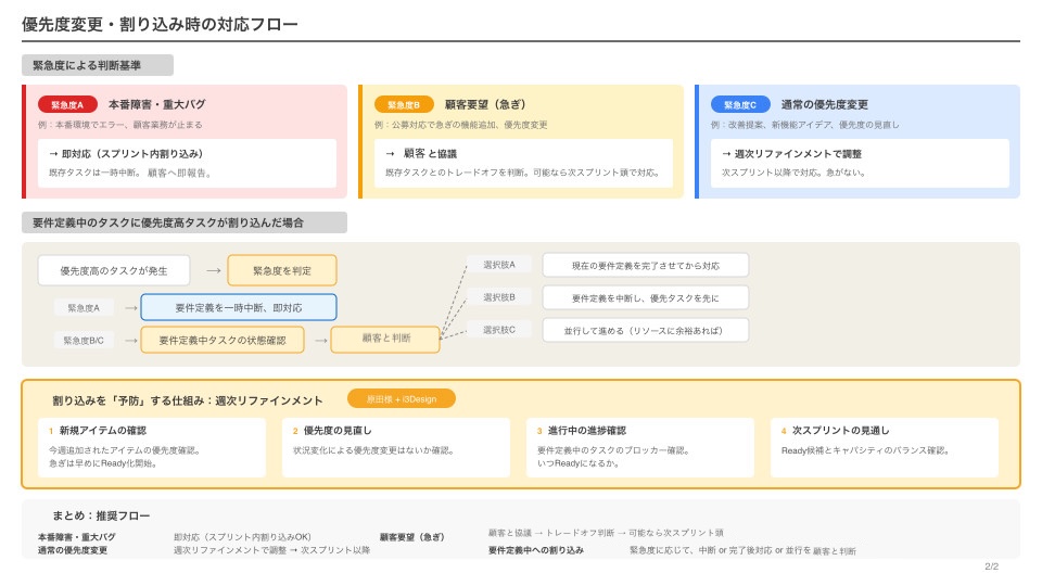 AIとの対話を通じて、緊急度による判断基準(A/B/C)や、週次リファインメントで割り込みを「予防」する仕組みなど、実践的なフローを整理することができました。