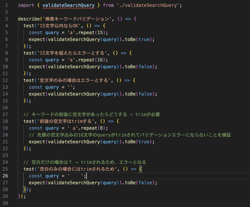題材として、Webアプリ内の「検索機能のバリデーション」を考えてみます。