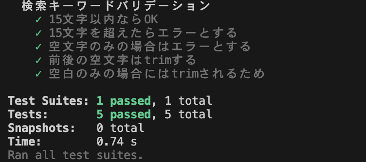 上記のテスト結果から、書いたテストが全て通り、Greenのステップが完了していることが確認できます。
